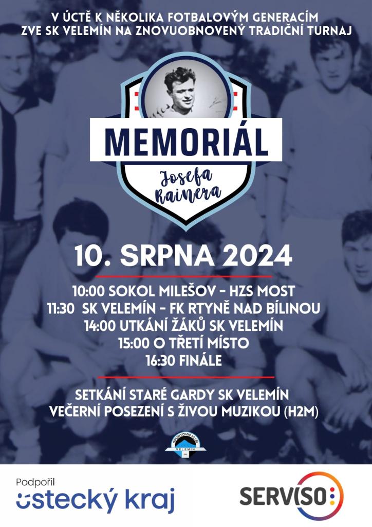 SK Velemín zve fanoušky na znovuobnovený letní turnaj! Navazujeme na tradici našich předchůdců a z úcty k jejich práci pro klub pořádáme 10.8. 2024 Memoriál Josefa Rainera. Těšíme se na dobrý fotbal a spoustu setkání kamarádů a přátel z obce a okolí!