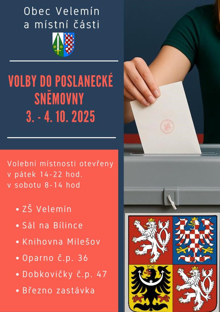 Volební místnosti v Obci Velemín budou otevřeny pro občany v pátek 3. října 2025 od 14:00 do 22:00 hodin a v sobotu 4. října 2025 od 8:00 do 14:00 hodin. Místní obyvatelé mohou hlasovat na několika určených místech, dle příslušných volebních okrsků, mezi které patří ZŠ Velemín, sál na Bílince, Knihovna Milešov, Oparno č.p. 36, Dobkovičky č.p. 47 a Březno zastávka.
