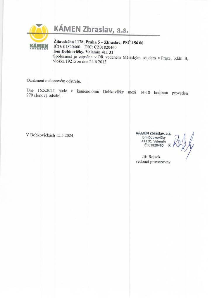Dnes 16.5.2024 bude v kamenolomu Dobkovičky mezi 14 – 18 hodinou proveden 279 clonový odstřel.