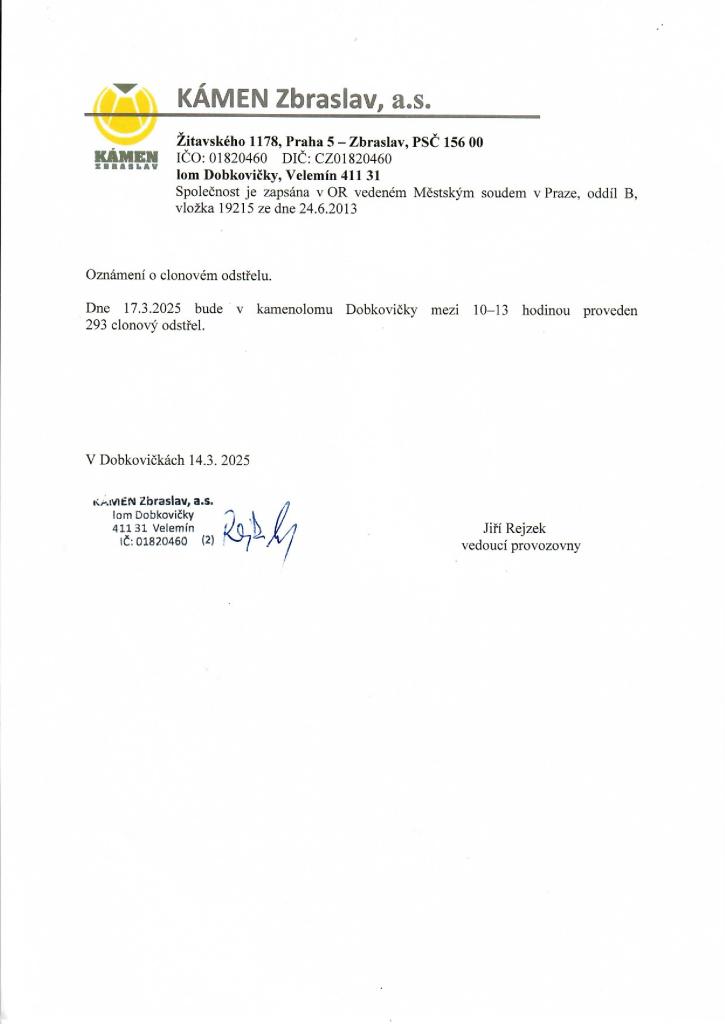 Oznámení o clonovém odstřelu v kamenolomu Dobkovičky