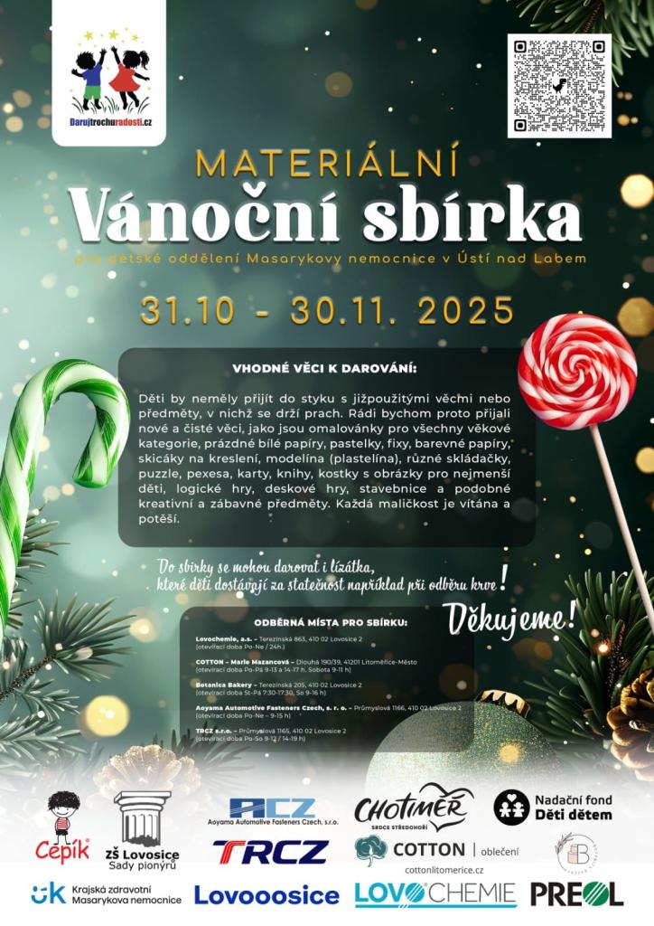 Již pátý ročník Vánoční materiální sbírky na podporu dětí z dětské kliniky Masarykovy nemocnice v Ústí nad Labem probíhá od 31. října do 30. listopadu 2025. Děkujeme všem, kteří se zapojí a pomohou malým pacientům překonat náročné chvíle strávené v nemocnici. Přinést můžete psací a kreslící potřeby, papírenské zboží, materiály pro kreativní tvoření, zábavné hry, knihy a stavebnice. Každý dar má obrovskou hodnotu a přináší radost. Dary je možné odevzdávat na různých odběrných místech v Lovosicích a okolí, kde je zajištěna jejich bezpečná doprava přímo na hematoonkologické oddělení.