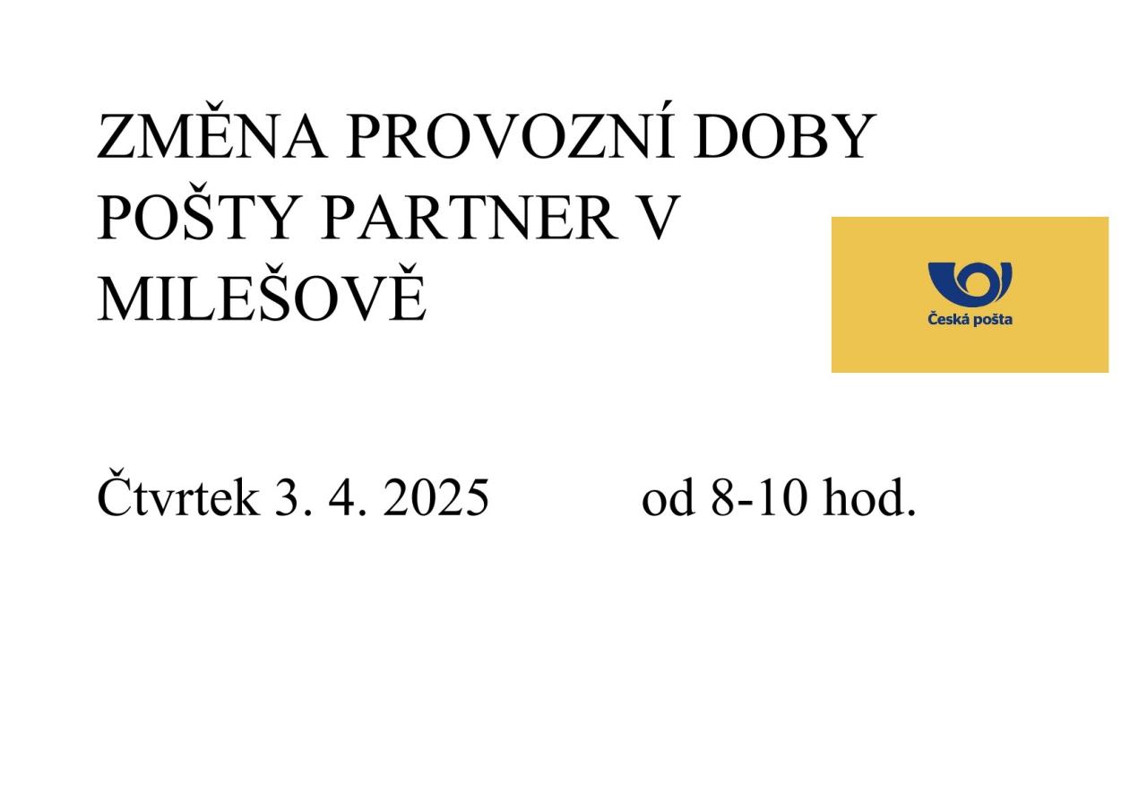Dne 3. dubna 2025 dojde ke změně provozní doby pošty Partner ve Velemíně a Milešově. Pošta v Milešově bude otevřena od 8 do 10 hodin, zatímco pošta ve Velemíně bude v provozu od 13 do 16 hodin. Děkujeme za pochopení.