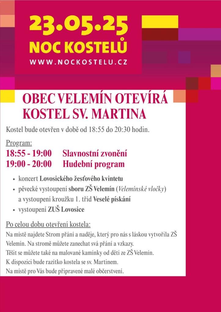 Obec Velemín otevírá kostel sv. Martina pro veřejnost. Akce se koná 23. května 2025 v čase od 18:55 do 20:30 hodin. Program zahrnuje slavnostní zvonění, hudební vystoupení Lovosického žesťového kvintetu, zpěv a vystoupení s flétnou dětí ze ZŠ Velemín a vystoupení ZUŠ Lovosice. Na místě bude připraveno malé občerstvení a možnost zanechat přání na Stromě přání a naděje, který vytvořila ZŠ Velemín. Těšíme se na vaši návštěvu!