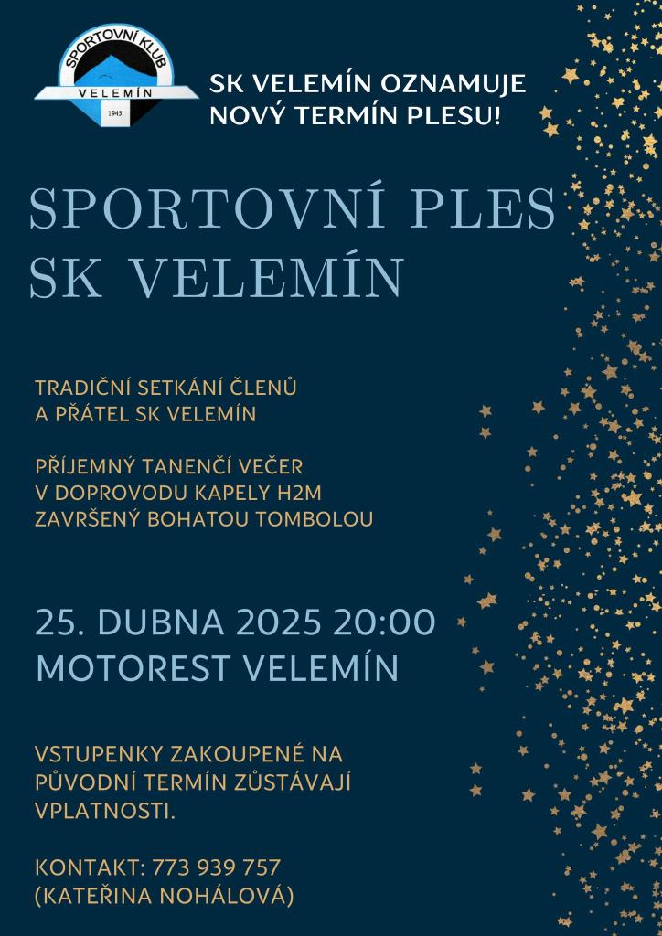 SK Velemín oznamuje nový termín tradičního plesu, který se uskuteční 25. dubna 2025 od 20:00 v Motorestu Velemín. Přijďte si užít večer plný tance a zábavy s kapelou H2M MC. Vstupenky z původního termínu platí.