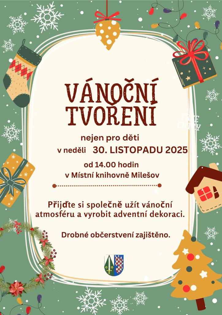 Pozvánka na vánoční tvoření v Milešově, které se uskuteční v neděli 30. listopadu 2025 od 14:00 hodin. Akce proběhne v Místní knihovně v Milešově, kde si společně můžete vytvořit krásné adventní dekorace.